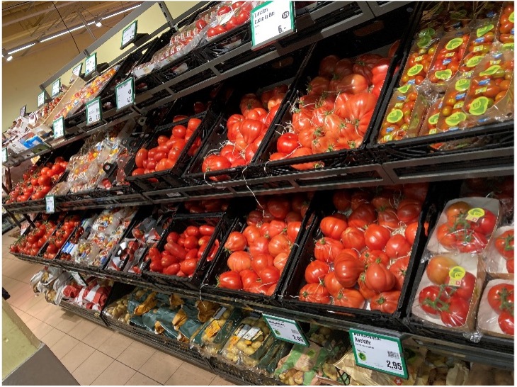 3枚目:スーパーの野菜売り場。トマトの種類がかなり多いです。